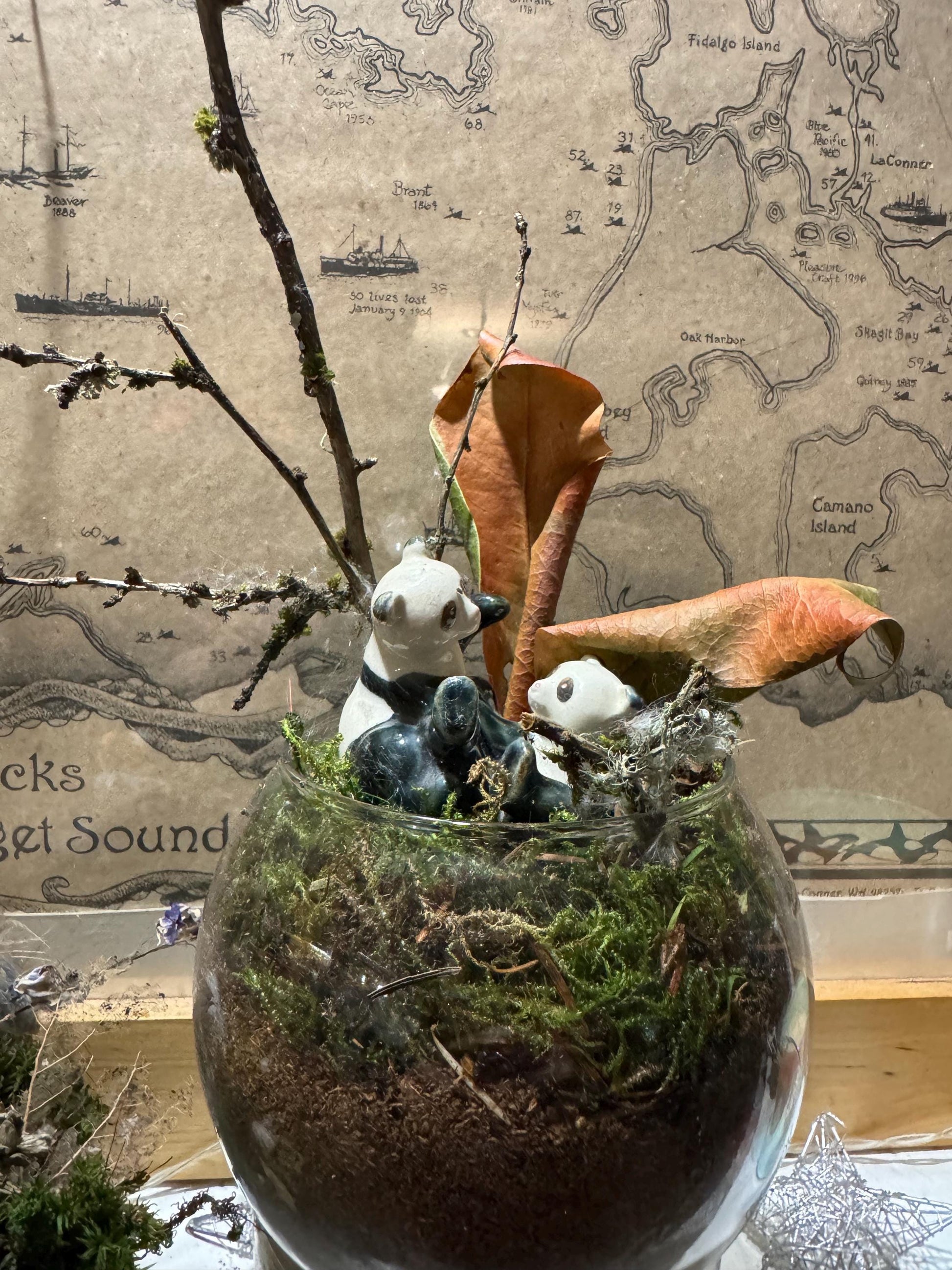 🐼🌿 DETAILS: • Real foraged PNW moss • Ceramic panda family figurines • Hand-placed natural elements: lichen, twigs, dried leaves, seed pods • Glass bowl approx. 5” tall × 5” wide • Comes with friendly care instructions